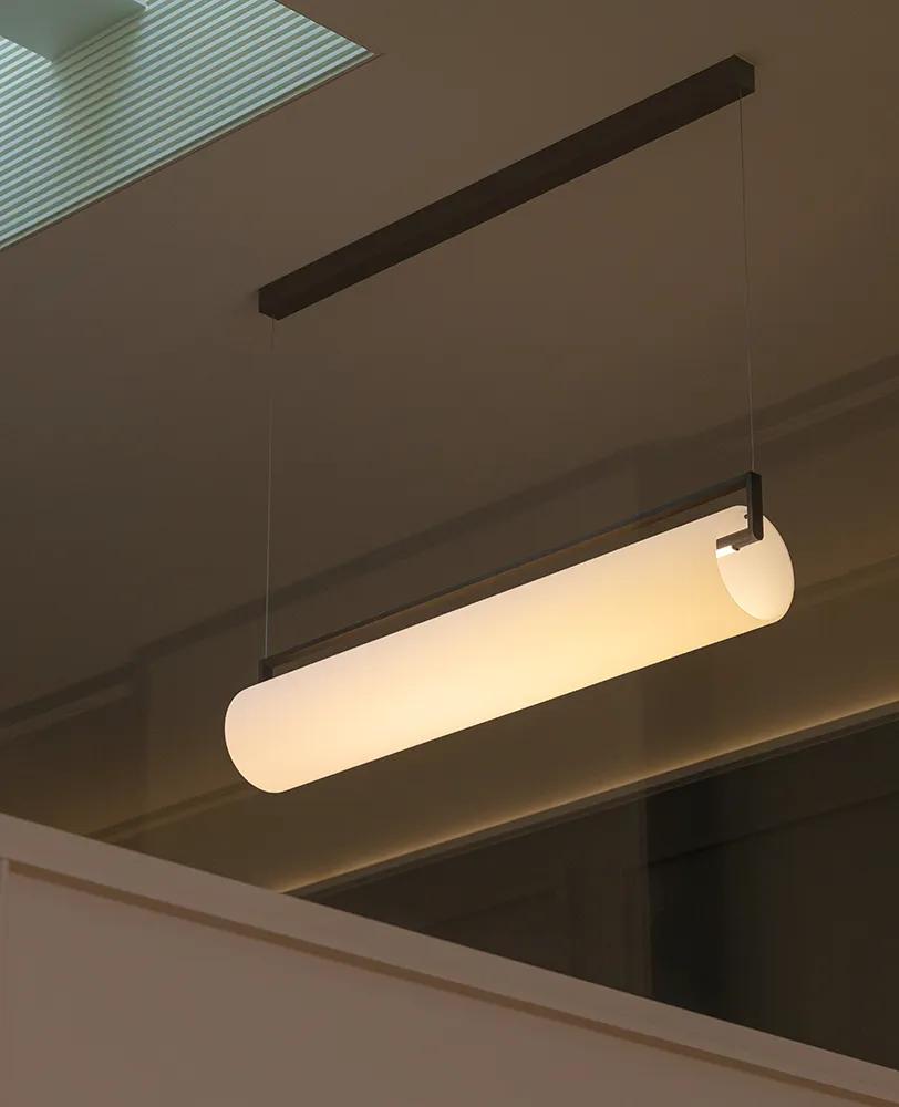 Sa structure, équipée de LED intégrées, est maintenue par des câbles presque imperceptibles, reflétant une sensation d’apesanteur. À l’intérieur, un diffuseur cylindrique en verre opalin soufflé à la main rayonne une lumière chaude à 360°, enveloppant l’espace tel la douce lueur d’une flamme. Associé à un réflecteur métallique incurvé, le luminaire projette une pluie poétique de lumière, apportant une atmosphère emplie de drame et de subtilité. Disponible dans une gamme allant de 2200 K —pour un effet de lumière de bougie— à 4000 K —plus éclatant et diaphane—, et en cinq dimensions différentes.