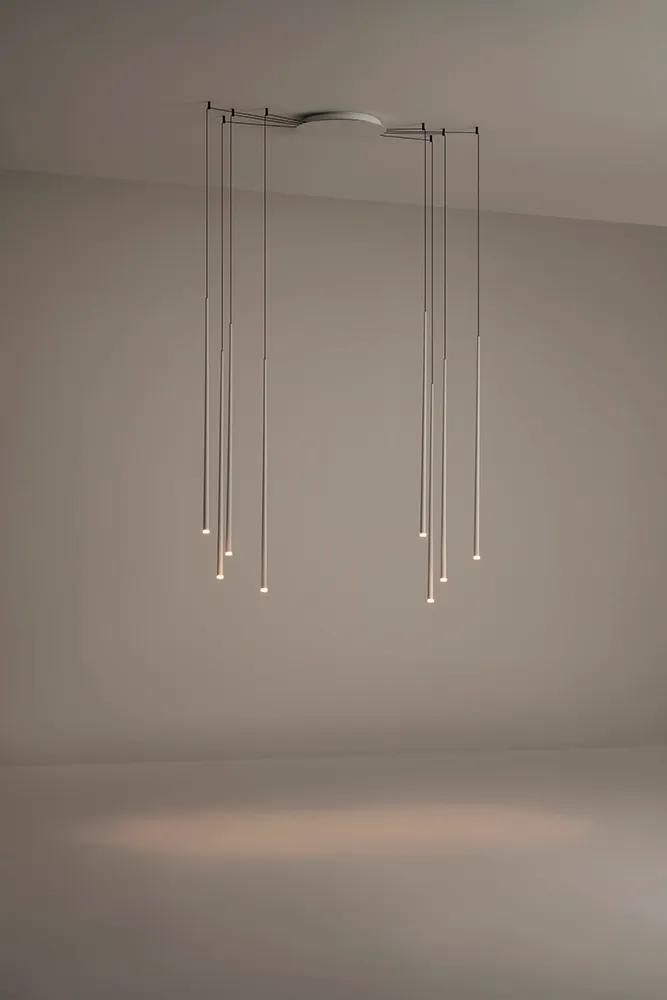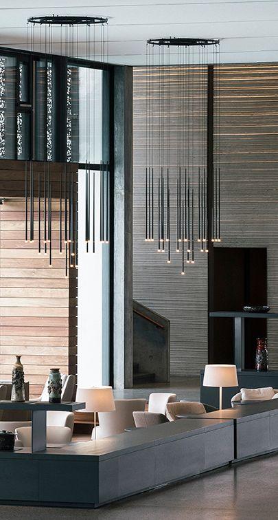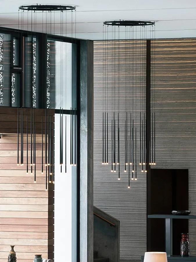 La collection Slim apporte une touche d'élégance à l'espace. Les suspensions délicates sont suspendues à des câbles en fibre comme des gouttes de lumière, faisant écho à l'architecture qui les entoure.