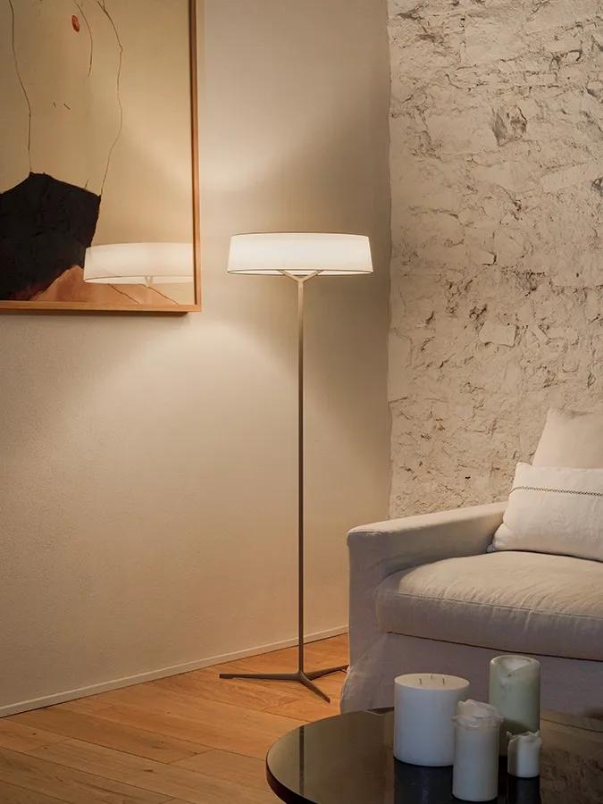 In the Dama floor lamp and table lamp, the cylindrical shade rests neatly on top of a slender aluminium stem which branches out into three legs available in two stylish finishes.