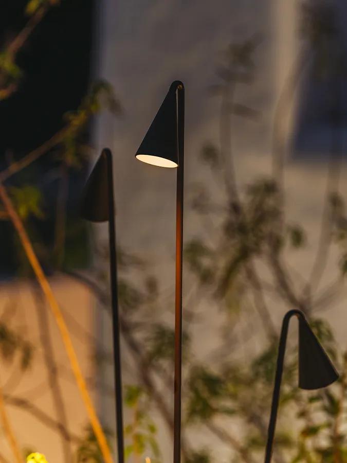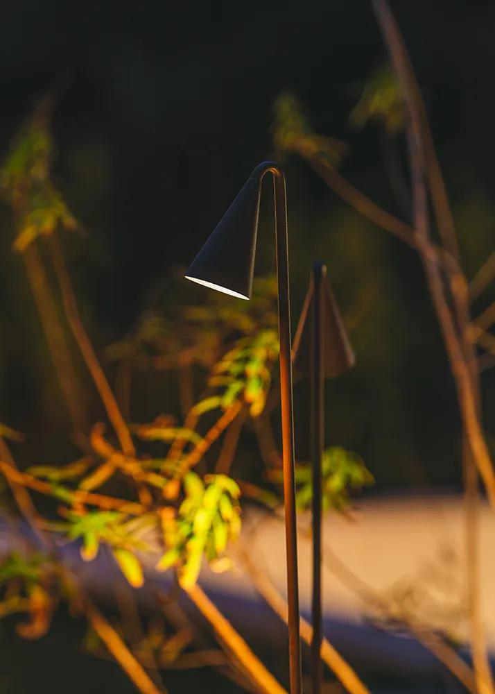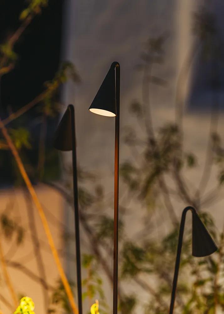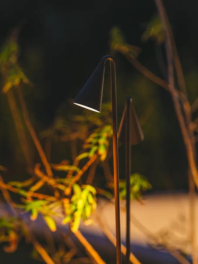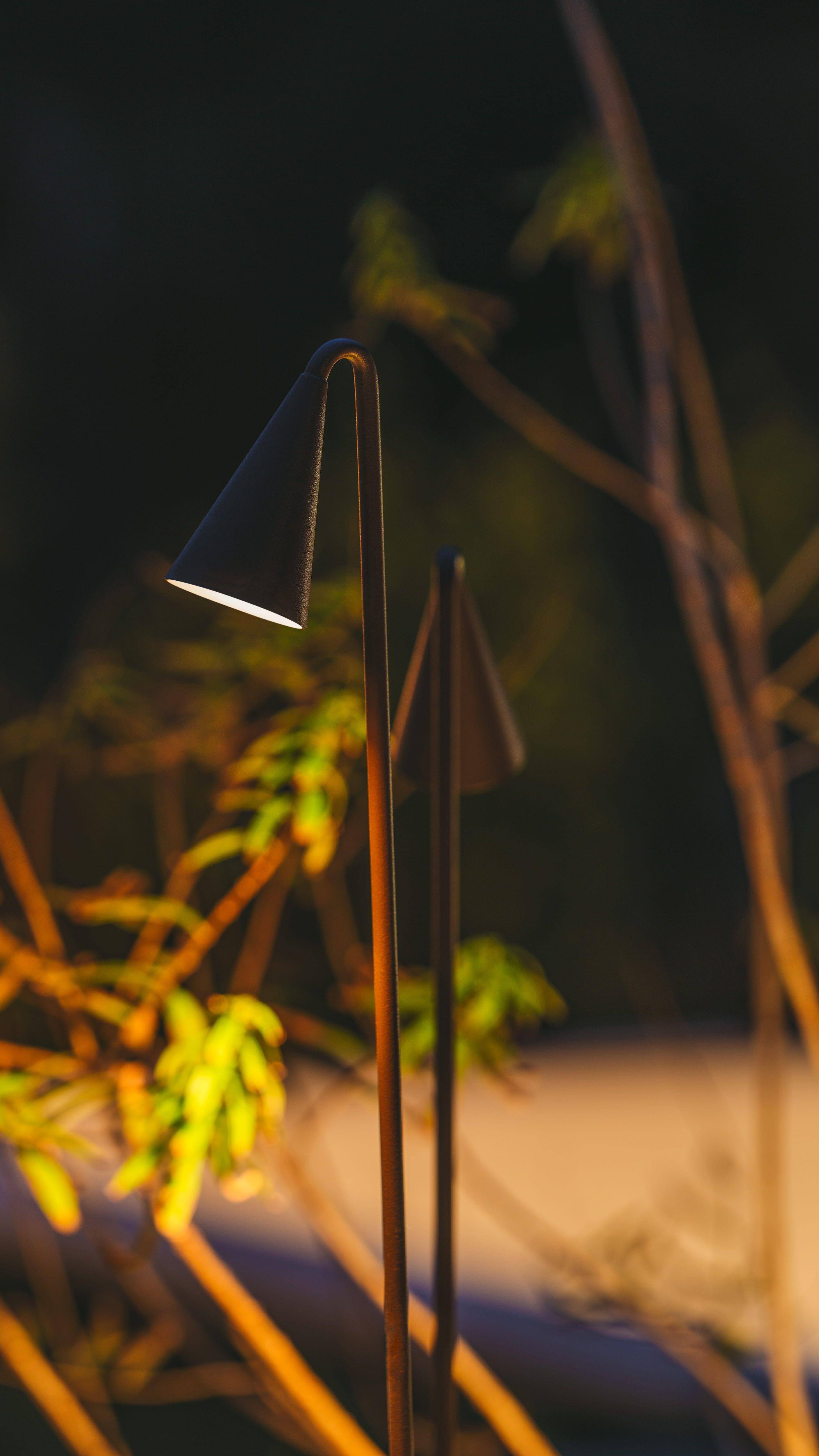 The Brisa outdoor lamp is intended to blend naturally into the garden’s greenery, courtyards, and walkways. The graceful silhouette and its warm, bright beam head lend it a quiet presence that accents an outdoor space rather than overpowering it.