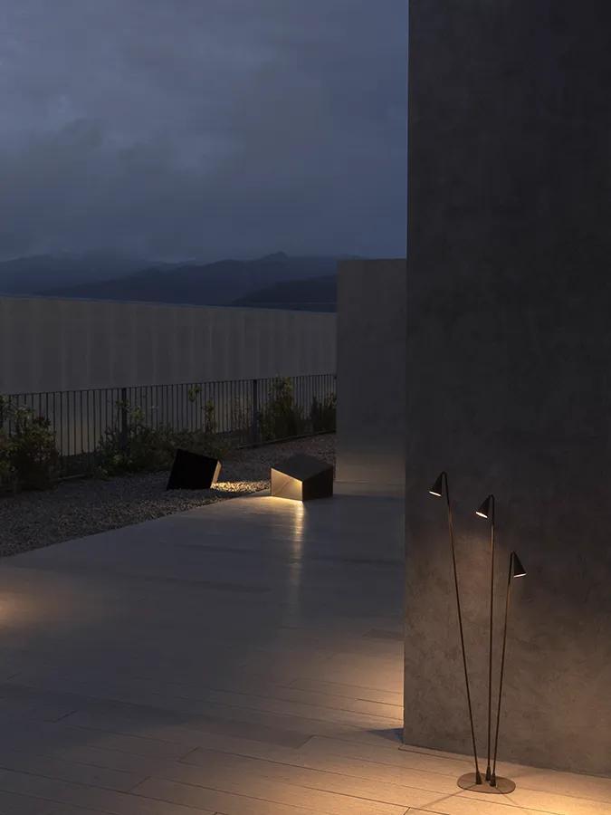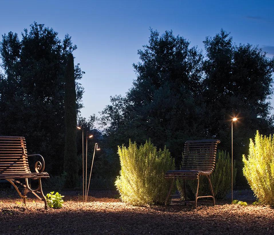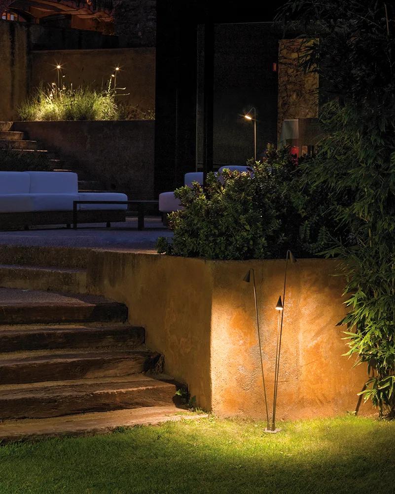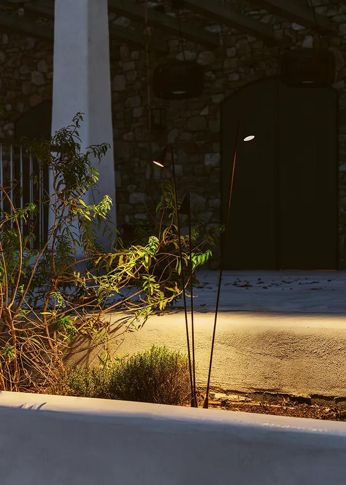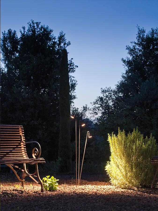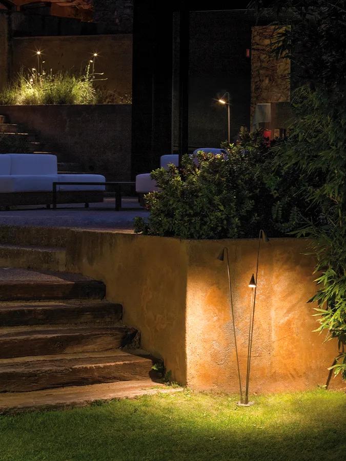 The Brisa outdoor lamp is intended to blend naturally into the garden’s greenery, courtyards, and walkways. The graceful silhouette and its warm, bright beam head lend it a quiet presence that accents an outdoor space rather than overpowering it.