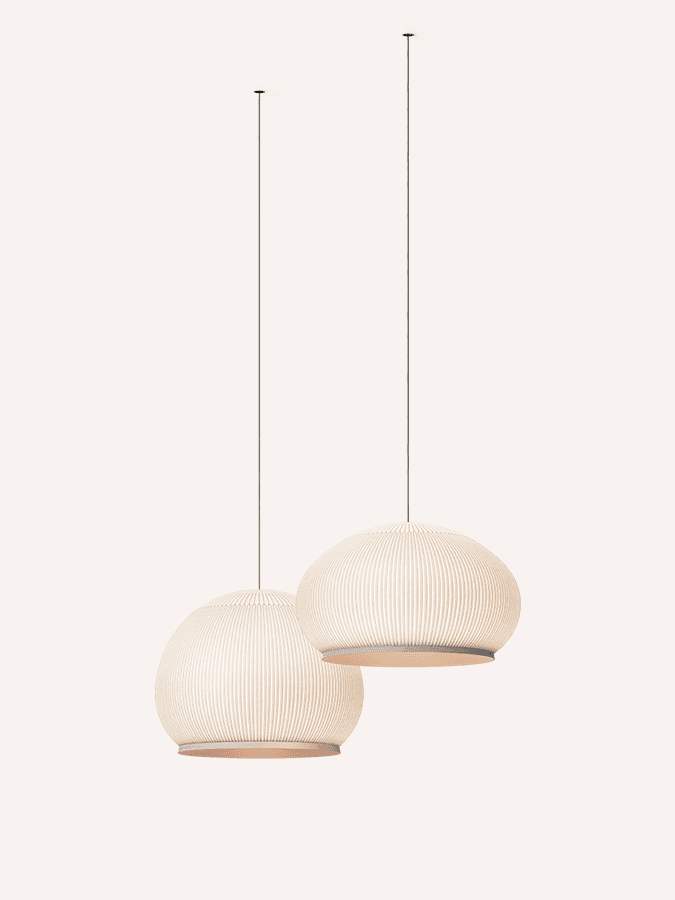 The bulk of each volume is covered in stretchy lycra, knitted into ribs using the plating technique. The darker ribs are opaque and tangible, while the space between the ribs is thinly knitted to transmit a diffused, 360-degree glow. Easy installation and dimming capabilities make the Knit pendant lamp the perfect solution for professionals looking for quality indoor lighting with an abundance of charisma.