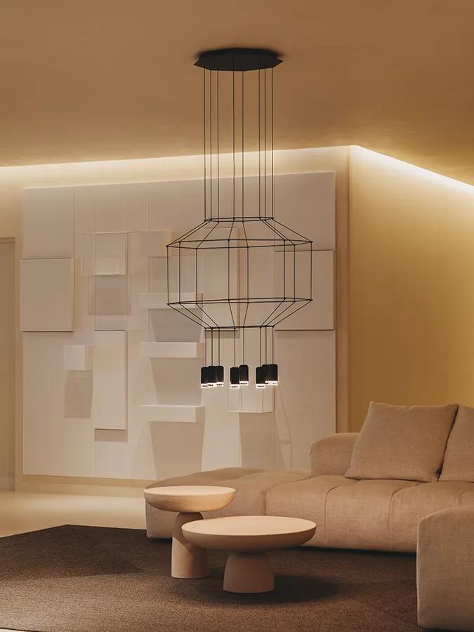 With its ultra-thin black electrical cables and the precise geometry of its volumes, the collection traces floating shapes in space that blend technology with poetry. Its main strength lies in its customisable nature: the cable length can be adapted, allowing tailored compositions that respond to the project, the function and the architecture.