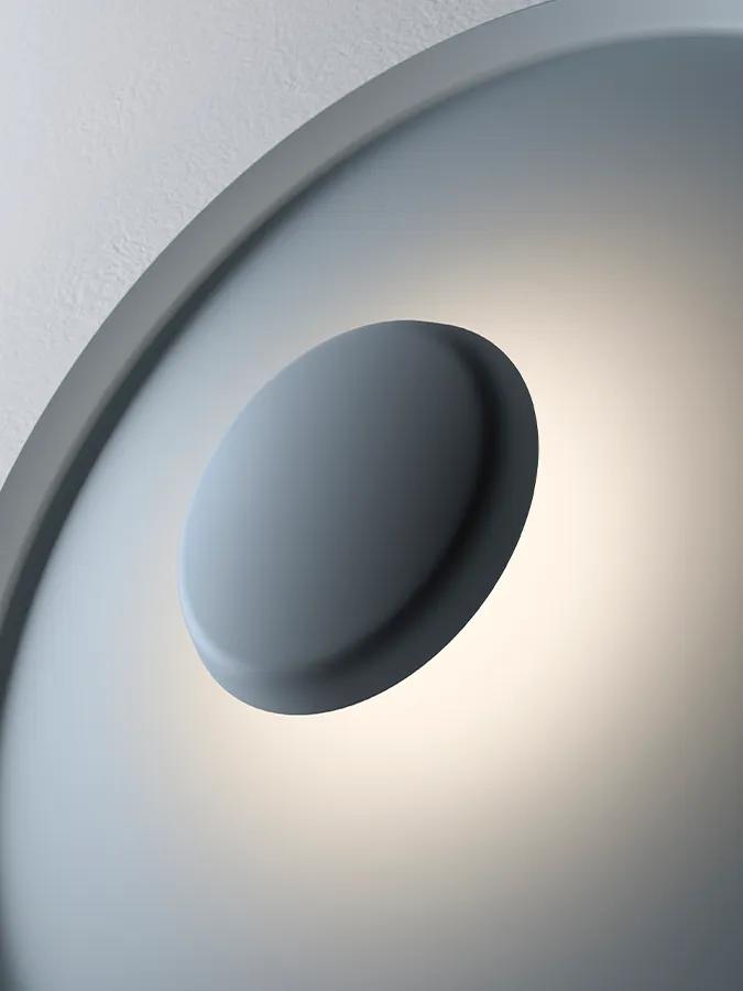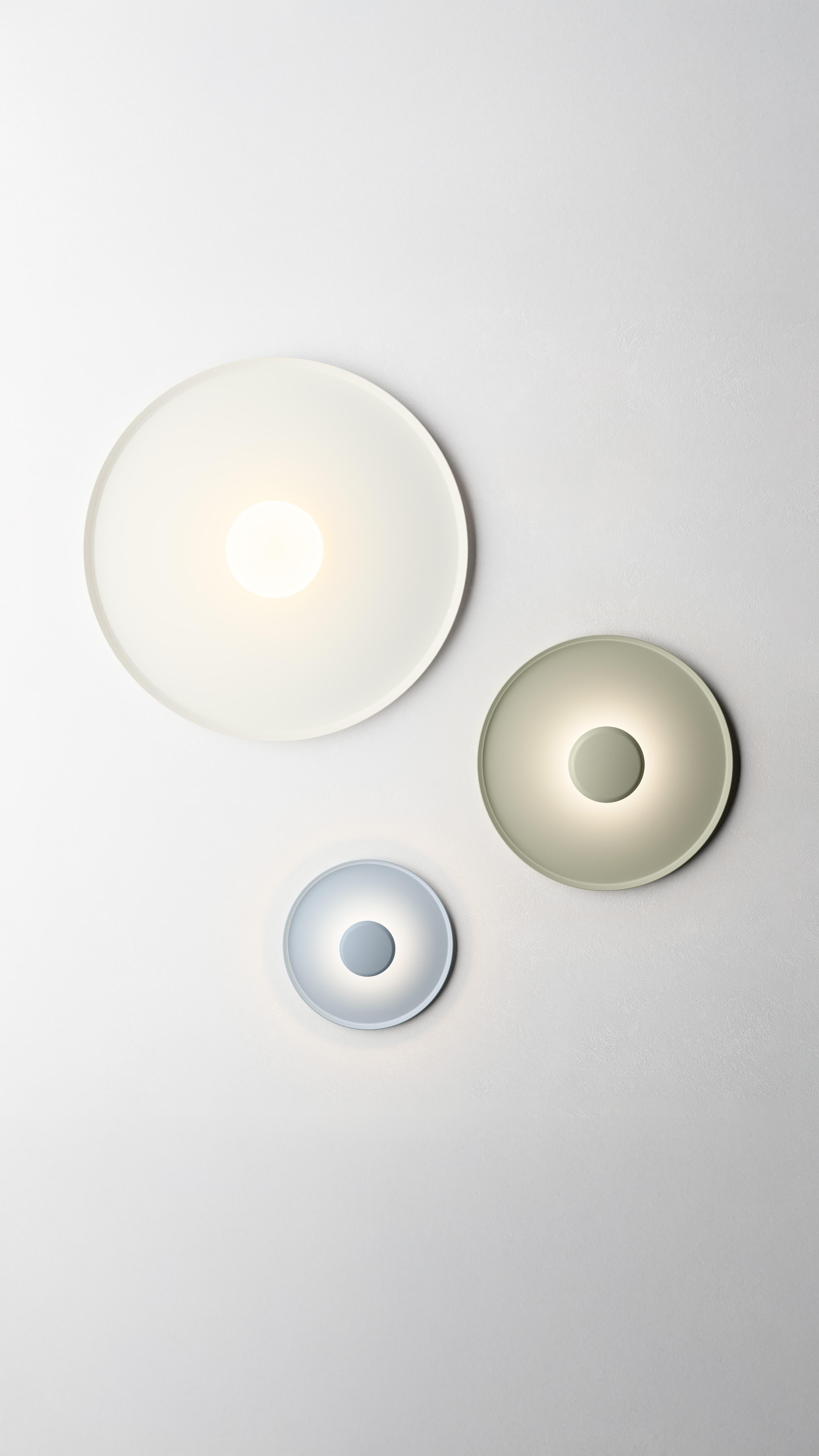 Its small central sphere reflects the light towards a larger surrounding ring generating a halo type effect of even and indirect lighting and creating a relaxed ambience. The light appears to be framed within its own diameter, its attractive and minimalist design doubles as a piece of abstract wall art.